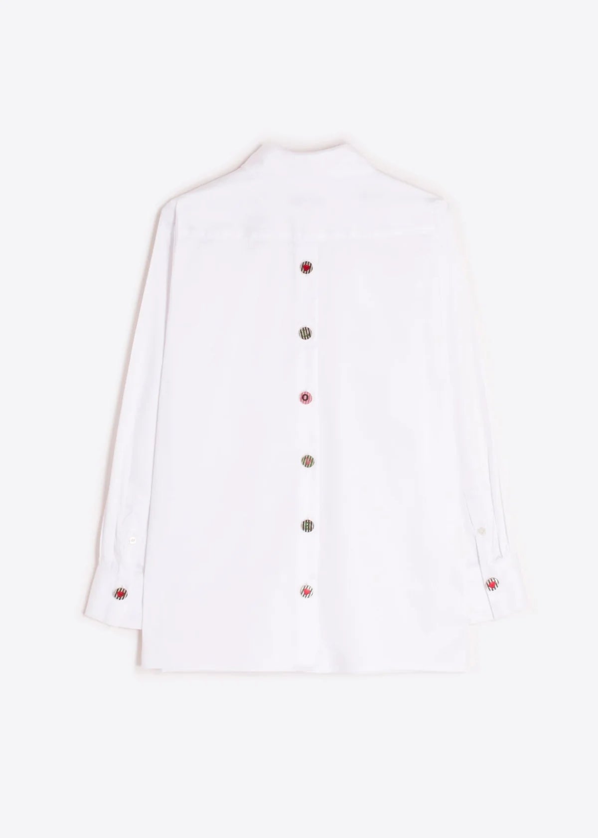 The Cora Top by Vilagallo is a charming white blouse featuring a classic button front for easy wear. Its playful twist comes from the back placket, where buttons cleverly spell out LOVE, adding a sweet and unique detail. Perfect for adding a touch of fun and romance to your everyday look.