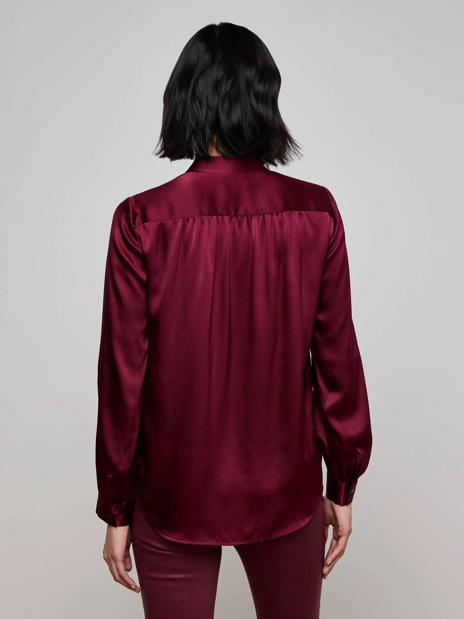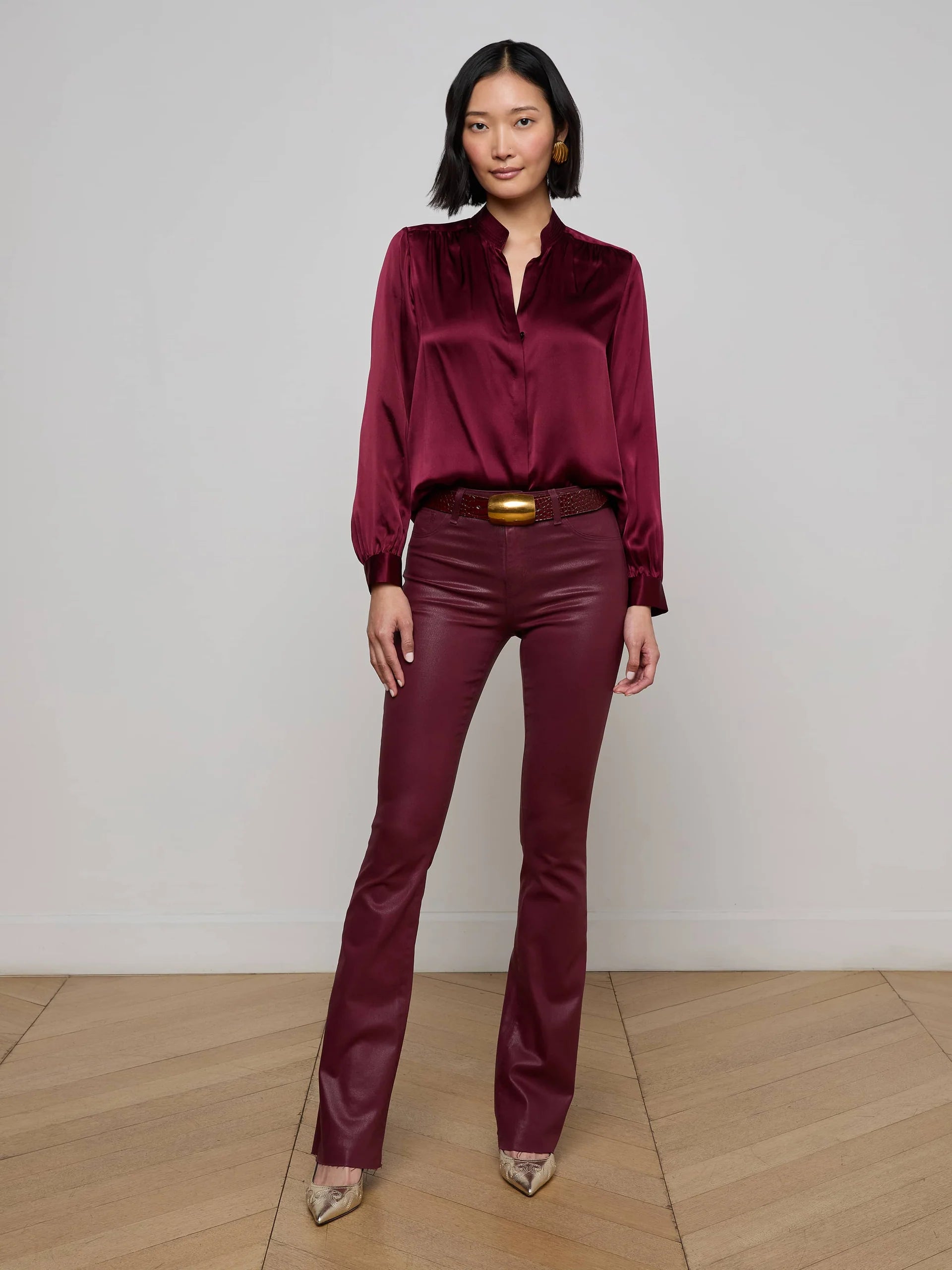 Add a touch of effortless elegance to your wardrobe with the Bianca Silk Blouse by L0Agence. Crafted with expert detail and gentle gathers, this classic piece offers an easygoing shape that feels as good as it looks. Now in a rich dark port shade, it’s perfect for adding a playful pop of color to any outfit.