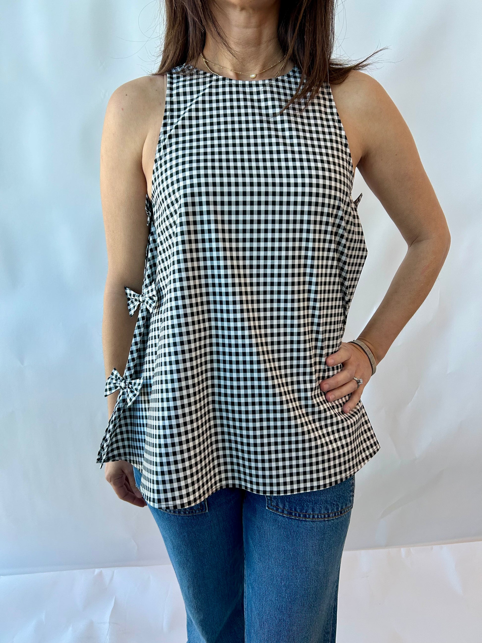 The Brynn Top by Caroline Constas is your new go-to for effortless cool. This sleeveless stunner features a classic black check pattern that plays well with everything in your closet. Tie details on the sides let you cinch it to your vibe—wear it loose and boxy for that relaxed feel, or pull it snug for a more defined silhouette. With its generous length that skims past your waist, you've got the perfect amount of coverage for tucking, layering, or just keeping things interesting. Simple, versatile, and way more fun than it has any right to be.