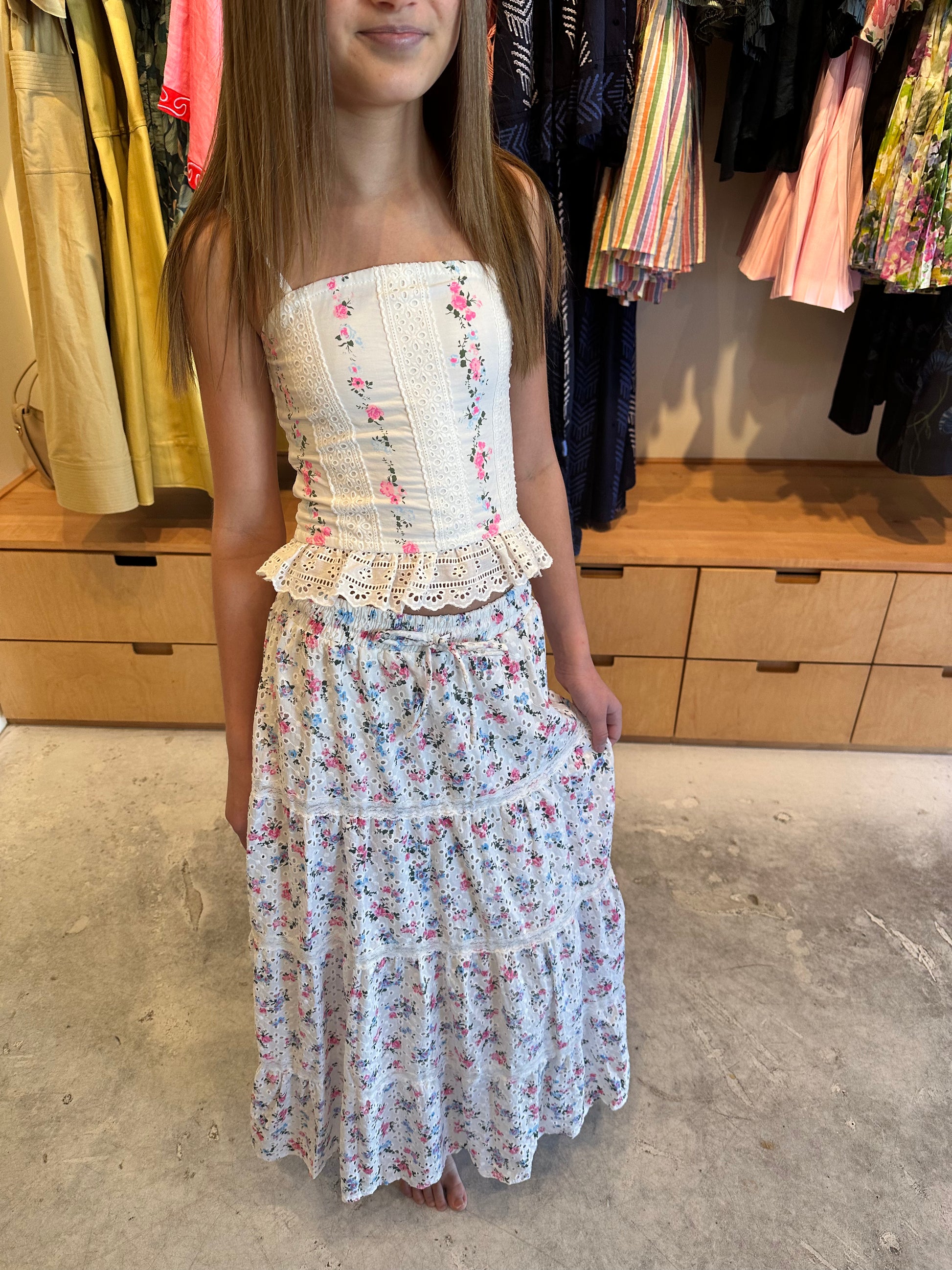 The Girls Eyelet Printed Maxi Skirt features a comfortable elastic tie waist and graceful tiered layers adorned with delicate ribbon details. Perfect for layering with the Girls Floral Top, it transitions effortlessly from casual playdates to special occasions like church services. The flowing silhouette and pretty embellishments make getting dressed fun, while the easy-to-adjust waist ensures a perfect fit as she grows. A versatile wardrobe essential that's as practical as it is pretty.