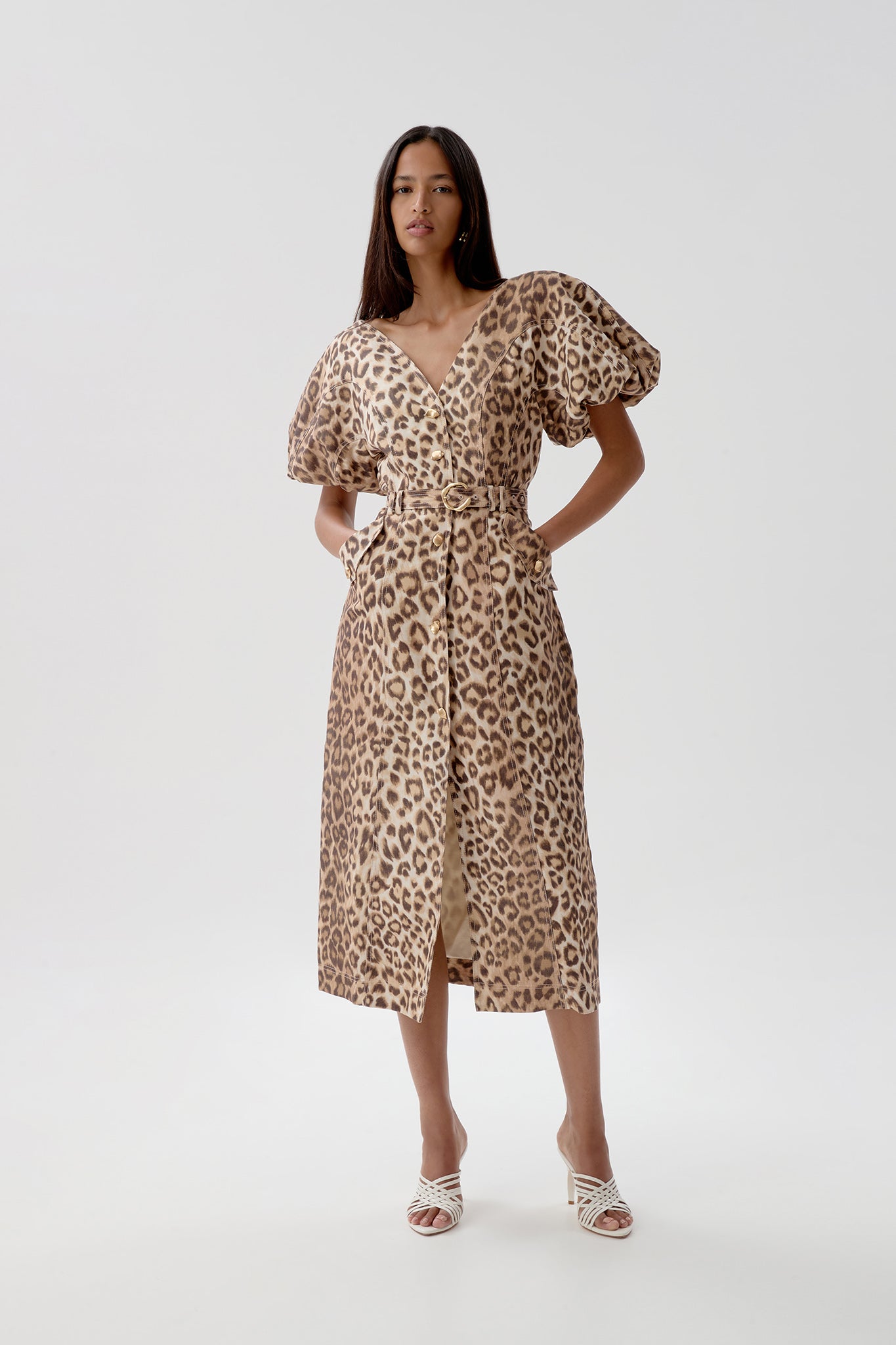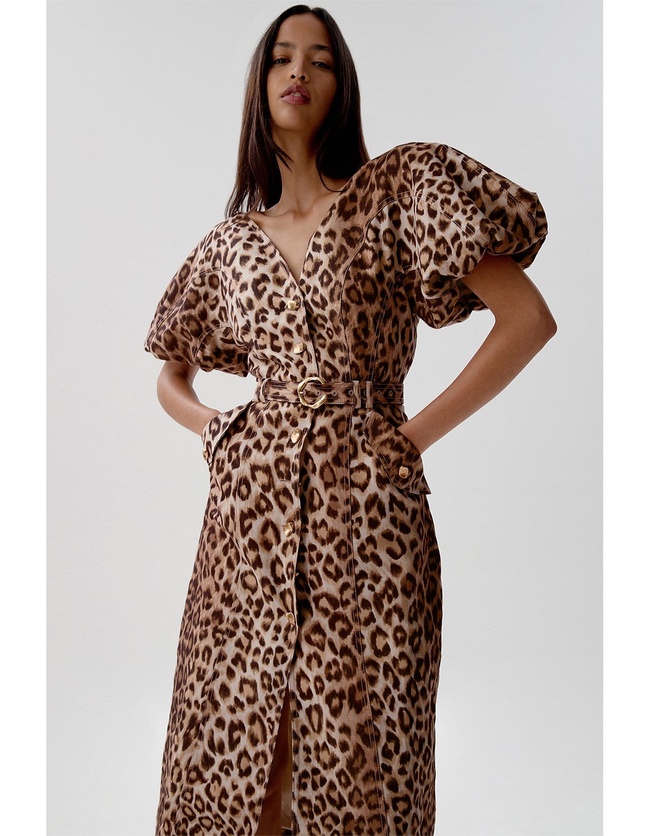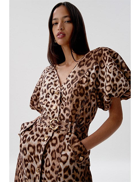 Who says fashion can't be fierce and functional? With puff sleeves, a v neck, a button down front, and belted pockets (that's right, pockets!), the Isabella Midi Dress by Aje is the perfect addition to your wardrobe.