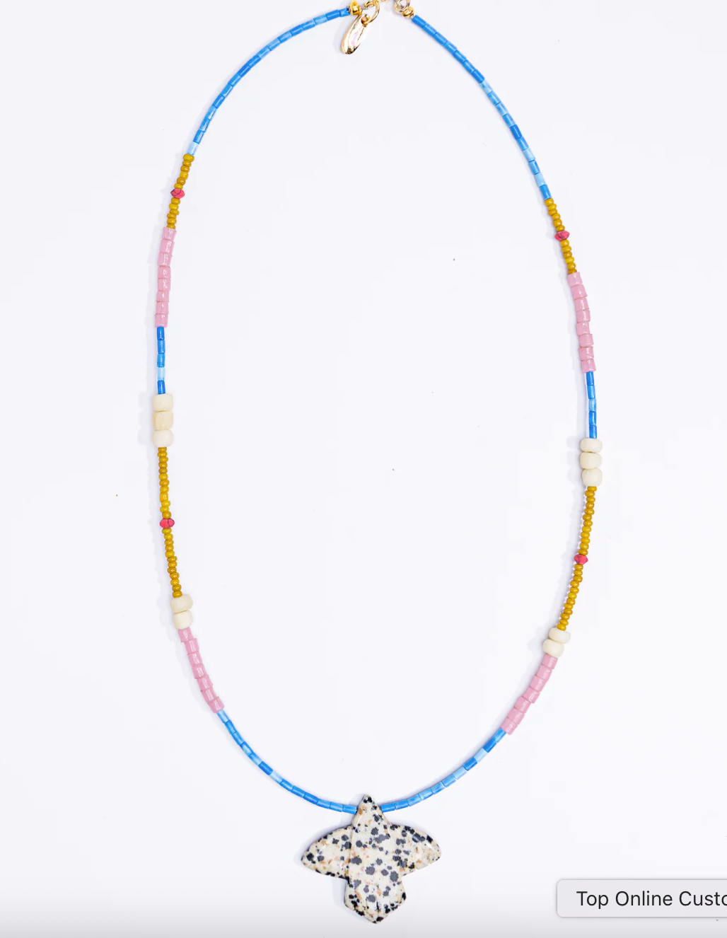 Jasper fly bird pendant mixed with small African beads. Measures 21” long.