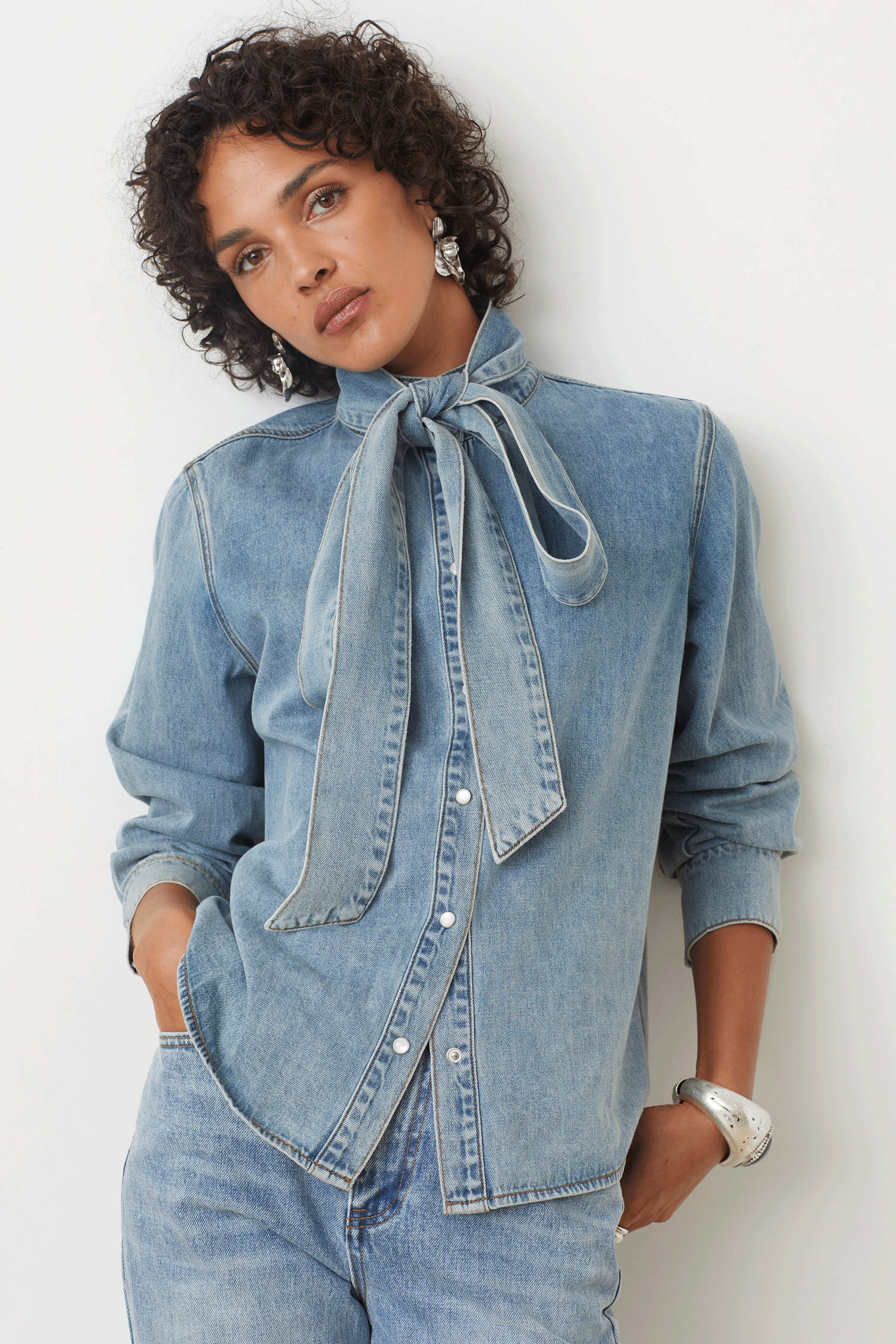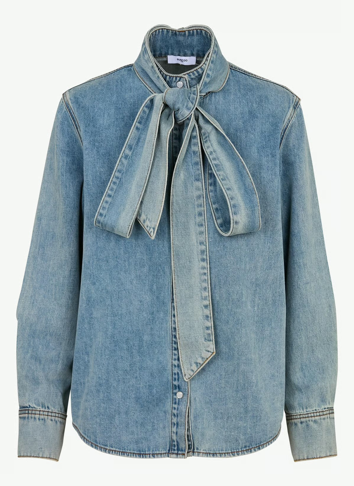 Add a playful touch to your wardrobe with the Laos Blouse by Suncoo. This light denim top features a charming tone-on-tone removable bow collar that lets you switch up your look with ease. With a front button closure and long sleeves, it combines comfort and style effortlessly—perfect for casual days or dressy moments that need a little extra flair.