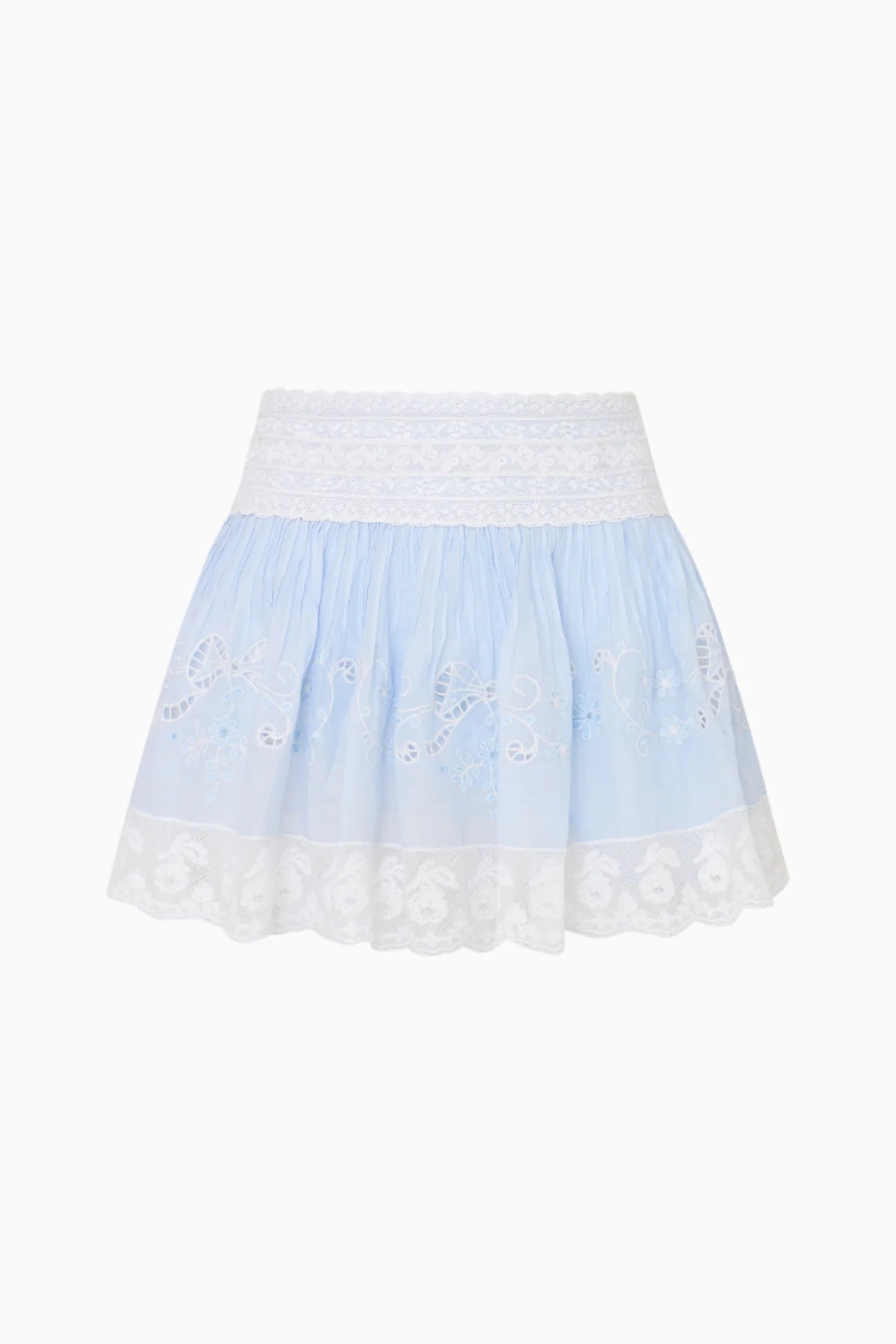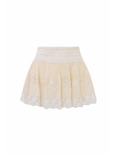 Loving on the Levant Skirt by LoveShackFancy. This airy skirt arrives in an ultra-thin, lightweight cotton voile fabric that’s crisp, but delicate for the high summer season. With a fixed waist, the waist yoke features an arrangement of stacked laces and shirring. The hem stuns with dancing floral embroideries.