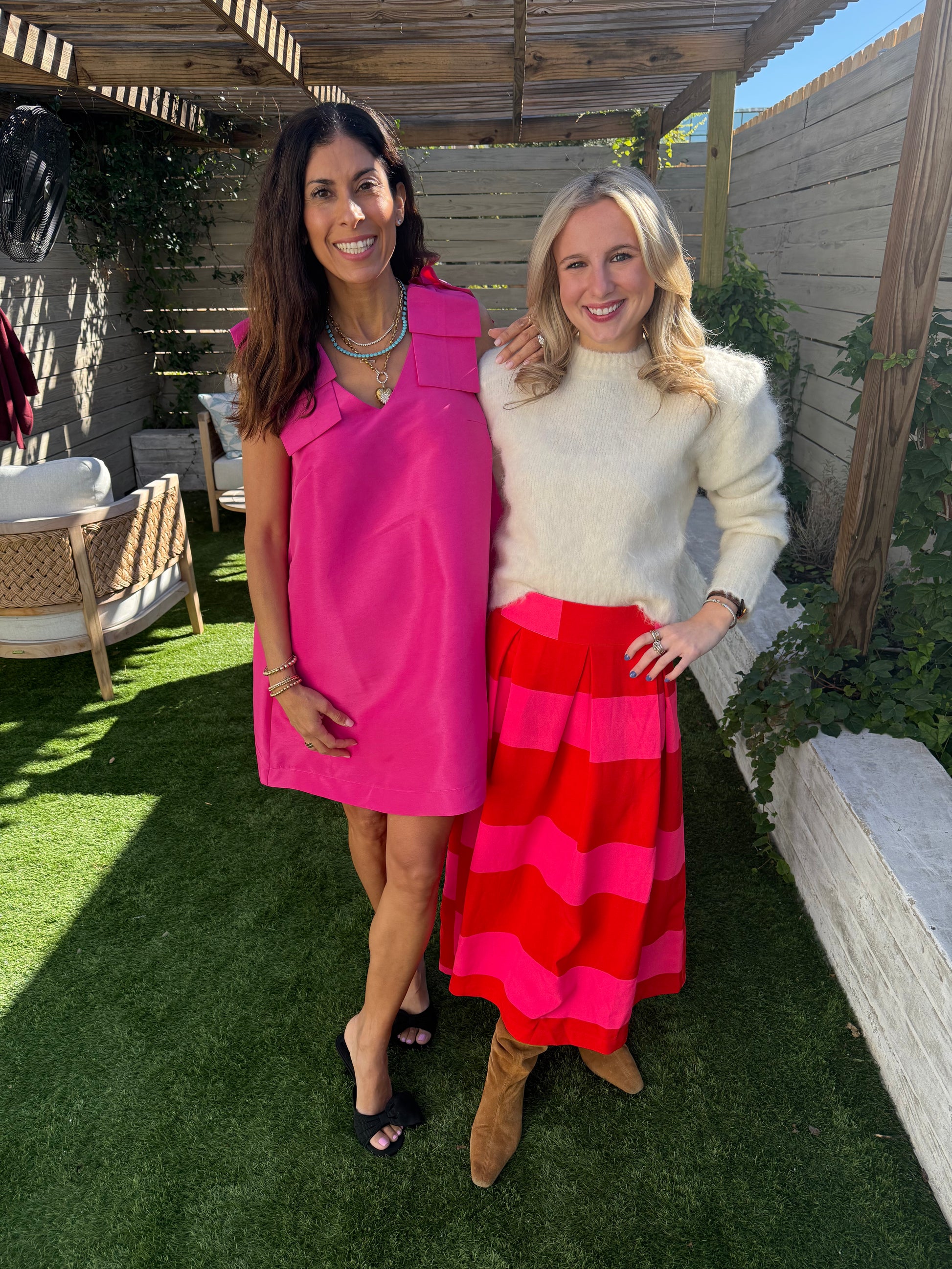 This vibrant midi skirt brings instant joy to your wardrobe with its playful pink and red striped pattern. The all-over pleating creates a graceful, flowing silhouette that moves beautifully with every step. An invisible side zipper keeps the look sleek and polished. Runs small size down.