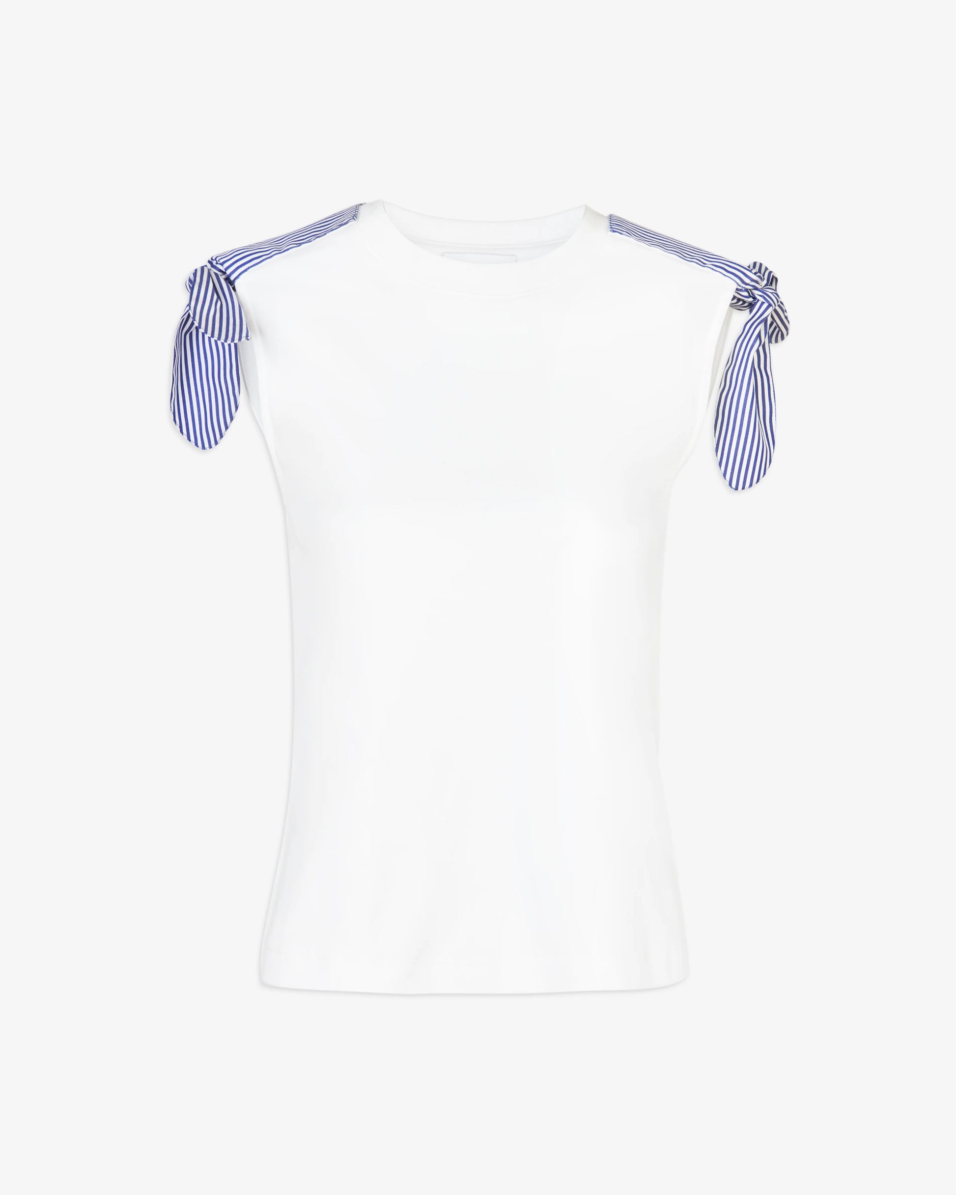 The Mary Top from Tanya Taylor features a crew neckline and sleeveless design for a breezy feel. Made from soft cotton jersey, it’s unlined for easy wear. Playful cotton stripe ties at the shoulders add a charming touch. Simply pull it on and enjoy effortless style!