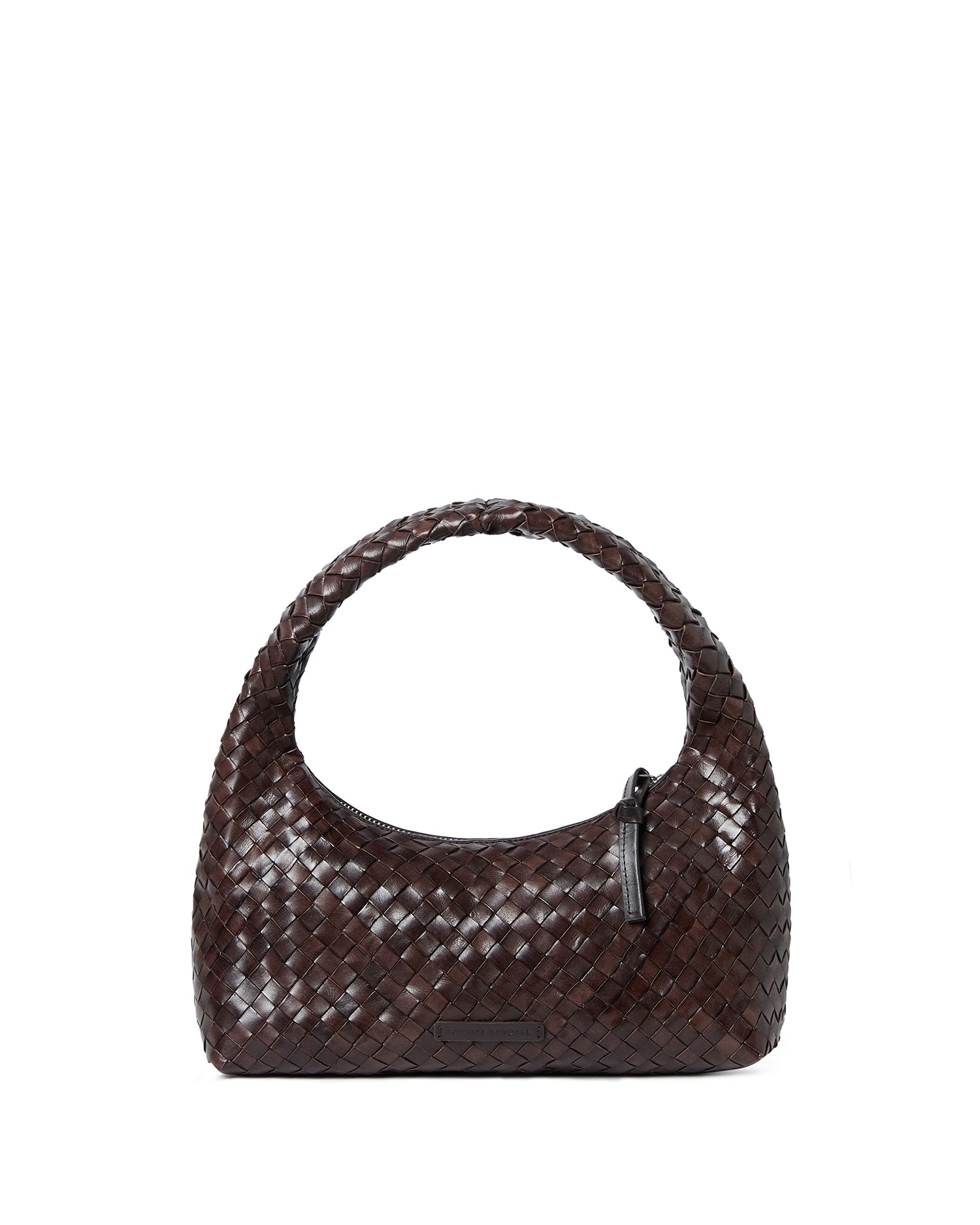 Discover the Mini Willow Bag by Loeffler Randall—a playful moon-shaped shoulder bag made from woven dark brown leather, featuring a zip closure and a soft cotton lining.