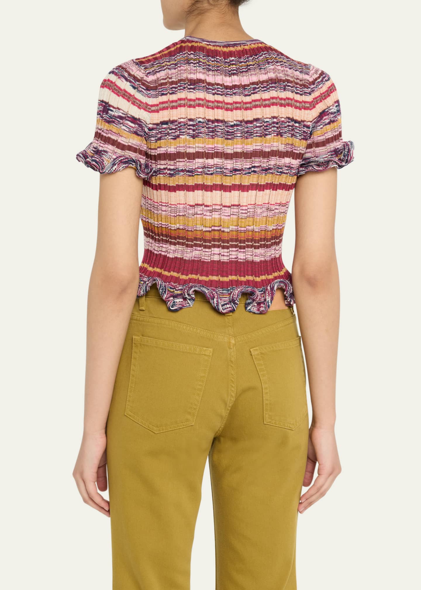 Adorned with swirling ruffles, the Miya Top is a playful addition to your knitwear. Designed for a close fit, this short-sleeve sweater is ribbed from space-dyed yarns that create richly vibrant stripes and is finished with rows of pointelle trims.