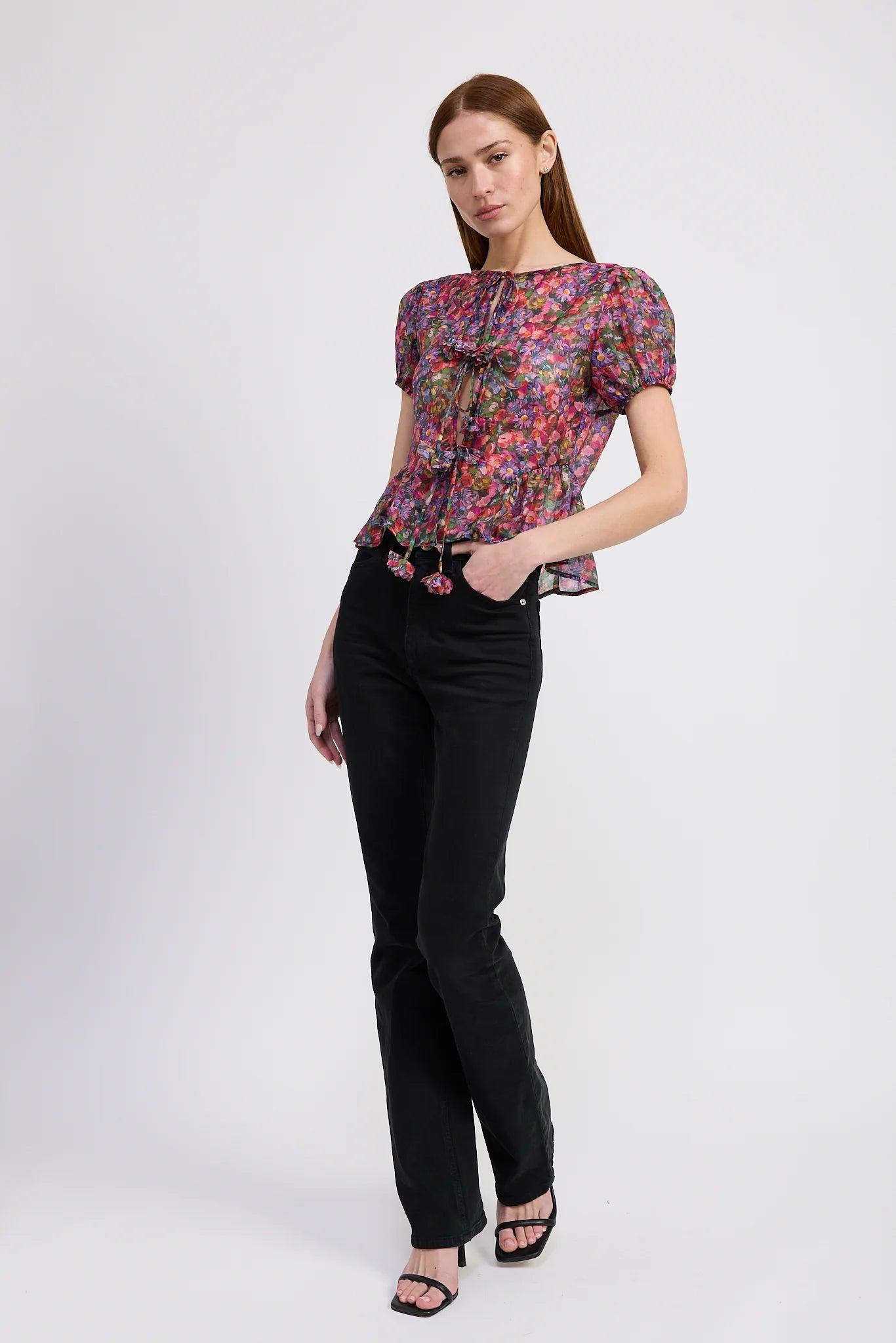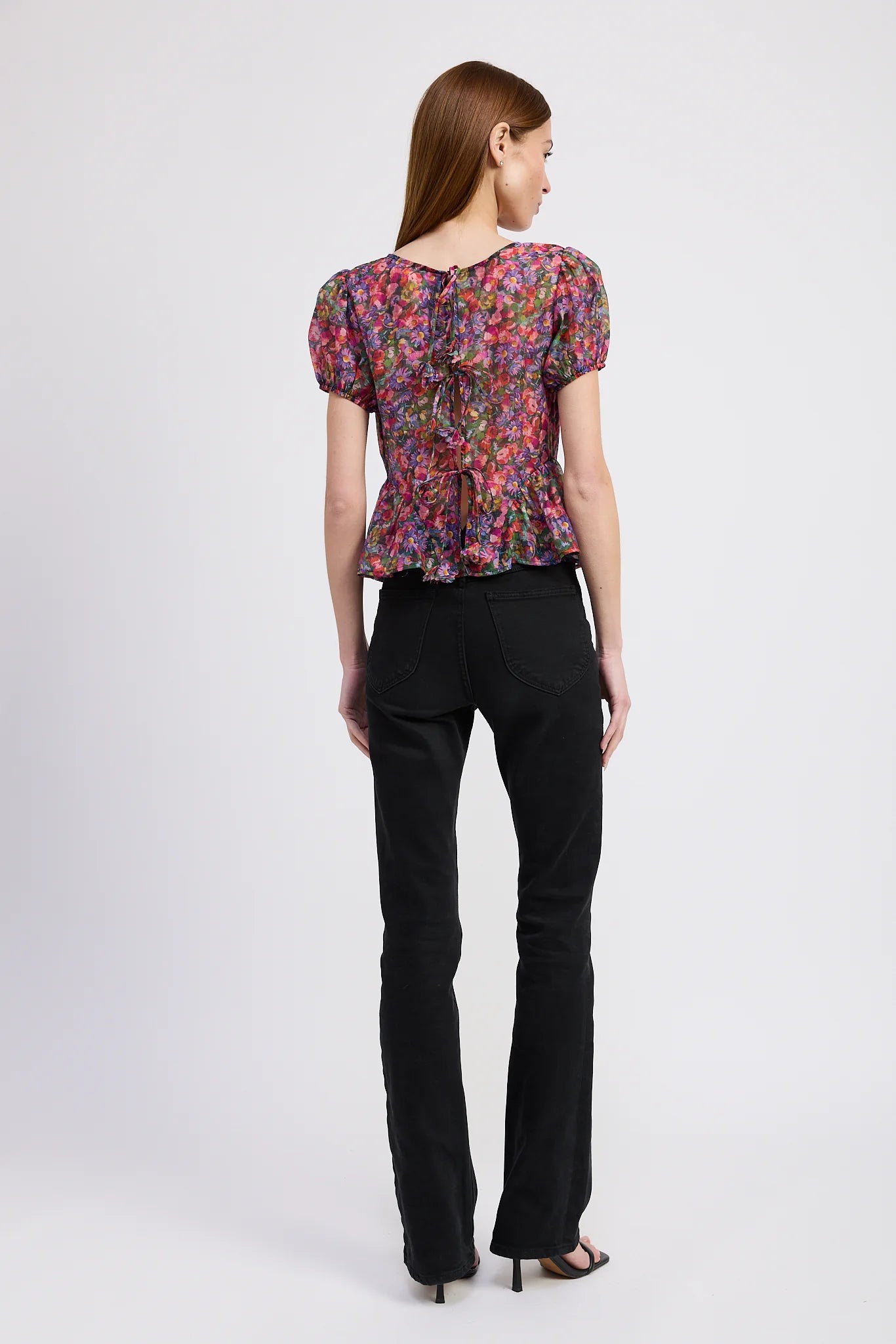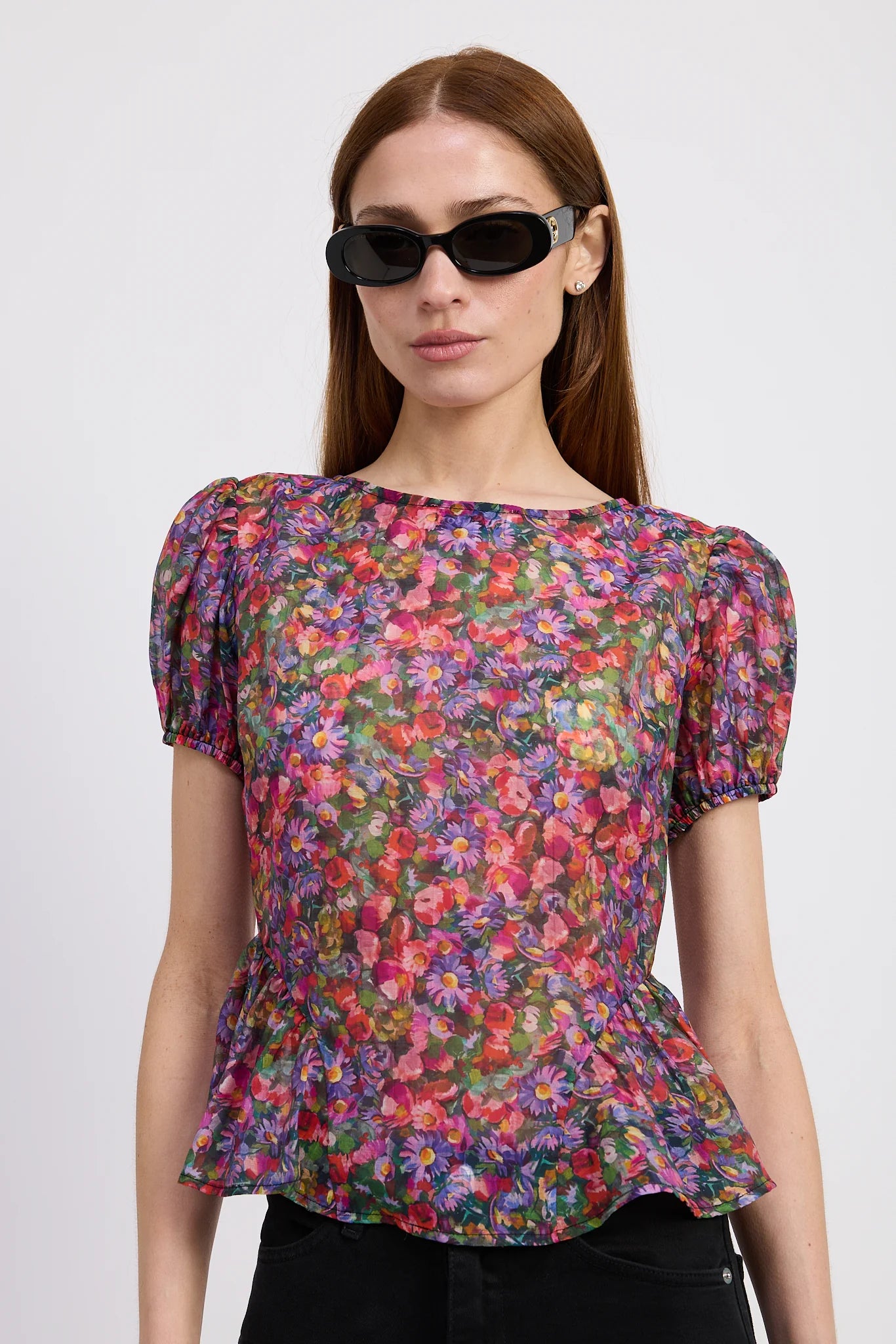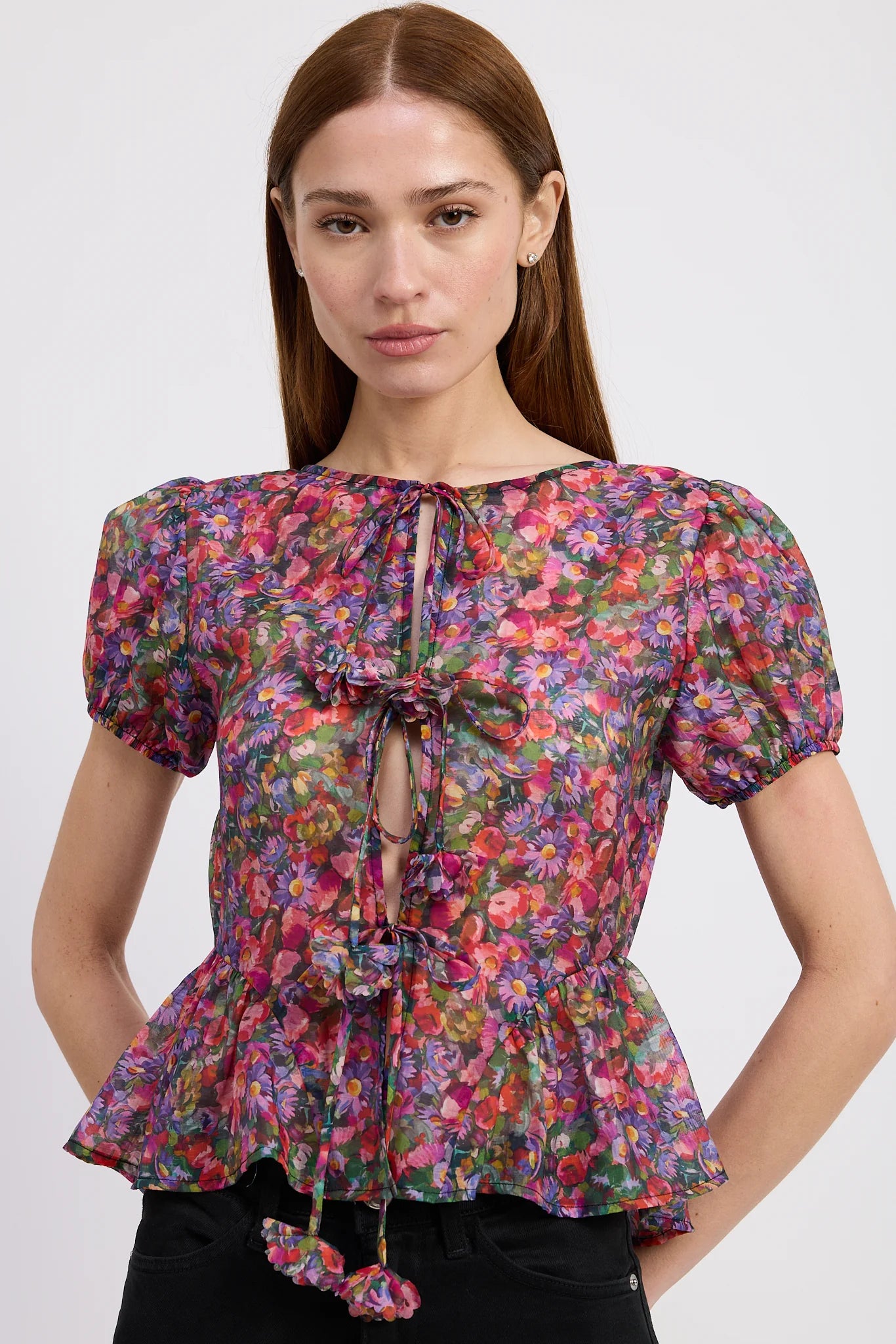 Add a playful twist to your look with the Naomi Top by En Saison. This vibrant purple multi-patterned blouse features charming short puff bubble sleeves and a sheer, reversible tie-back detail that adds a flirty touch. Its peplum silhouette brings a fun, lively flair, perfect for brightening any day with color and whimsy.