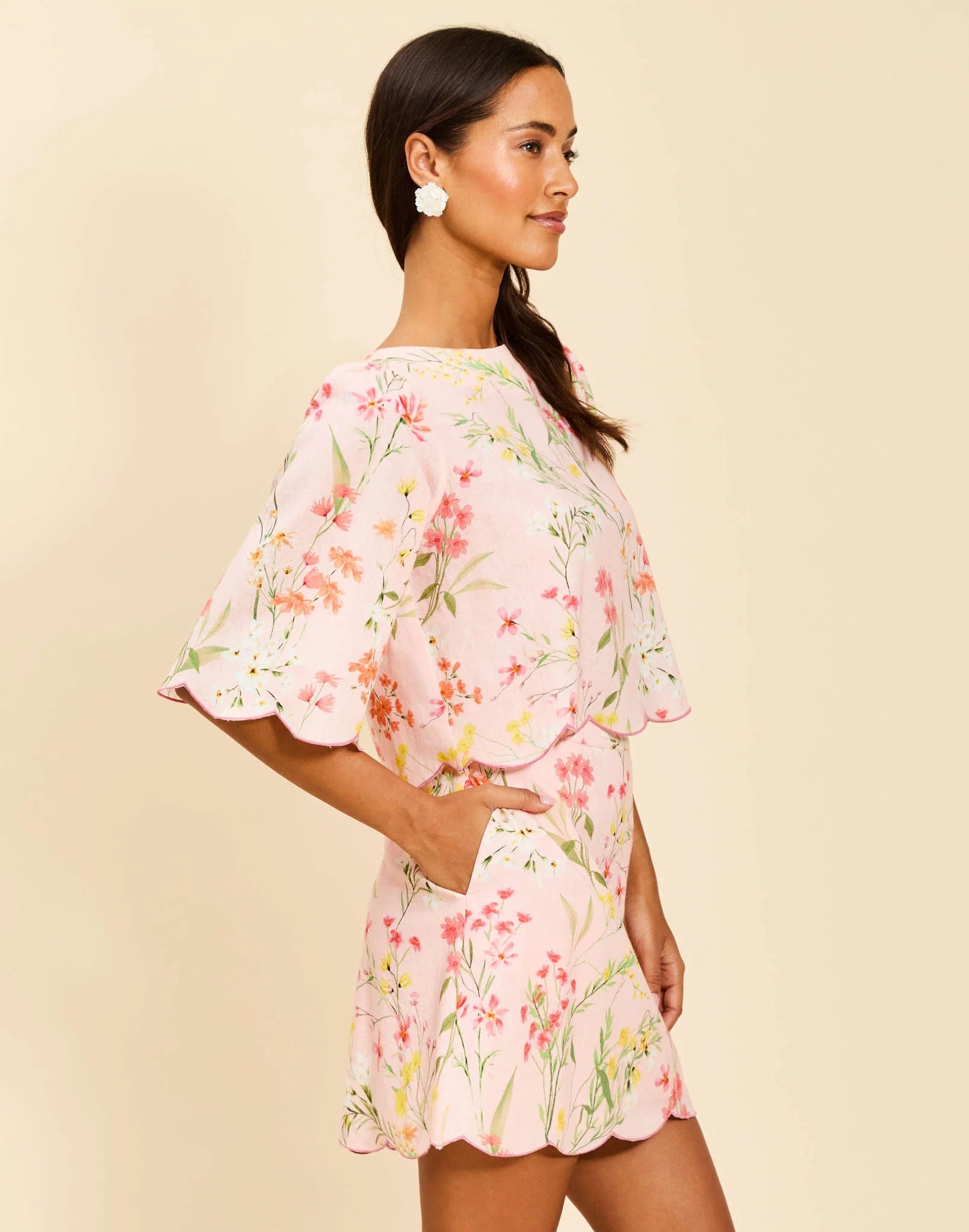 Introducing the Pilar Scallop Mini Skirt by Mestiza, a romantic A-line silhouette that combines delicate scalloped embroidery with everyday practicality. The refined hem detailing pairs beautifully with the Charlize Top, while functional hand pockets and full lining ensure comfort and versatility. A concealed side zipper keeps the look polished and put-together.