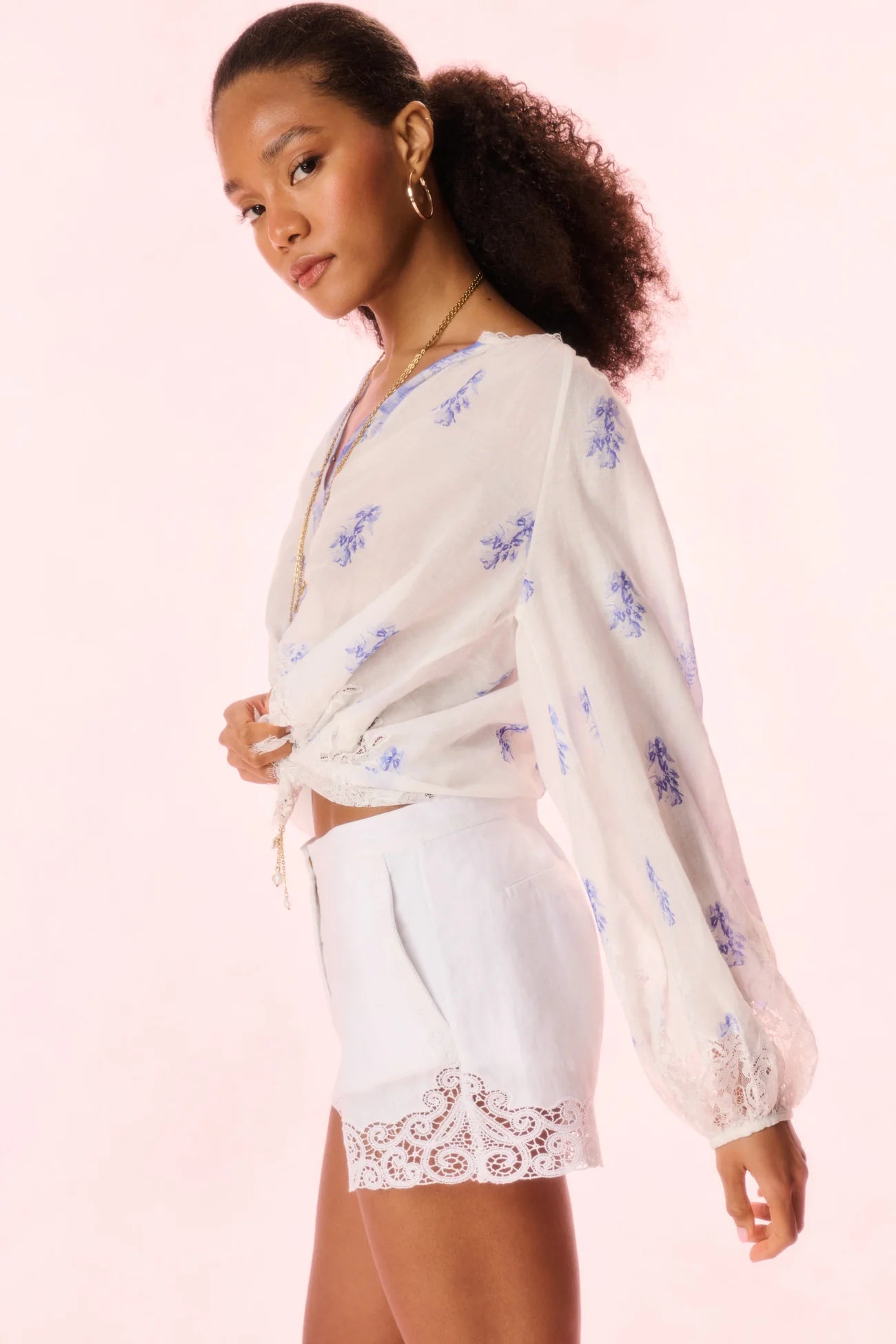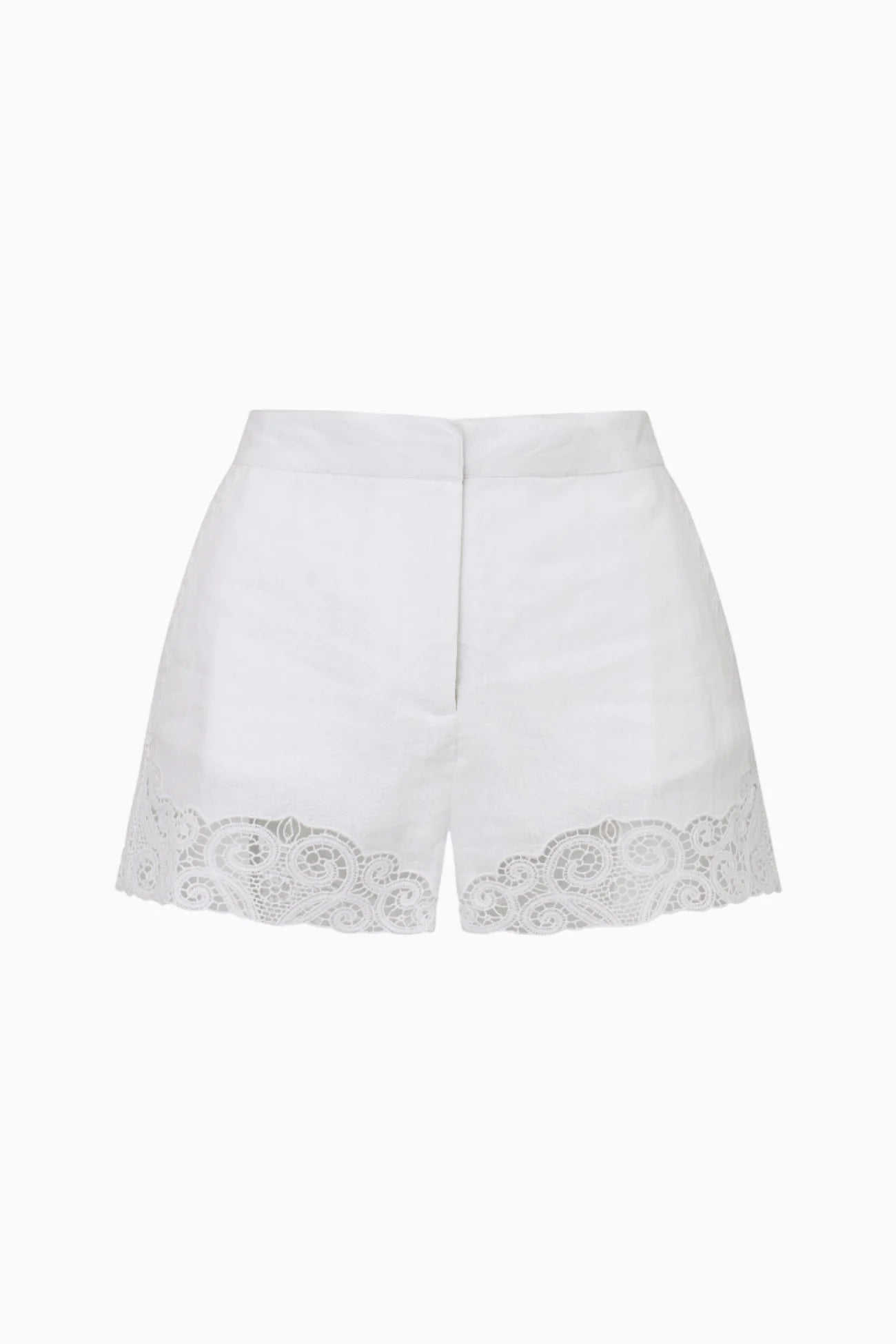 Elevate your wardrobe with the Quindi Shorts by LoveShackFancy. These chic bottoms arrive in a crisp, lightweight linen featuring custom developed battenburg lace that’s used as a wide trim around the leg openings giving it an elegant look. Ideal for the summertime, easy shorts have a fixed waist for a flattering fit and a center front zipper closure.
