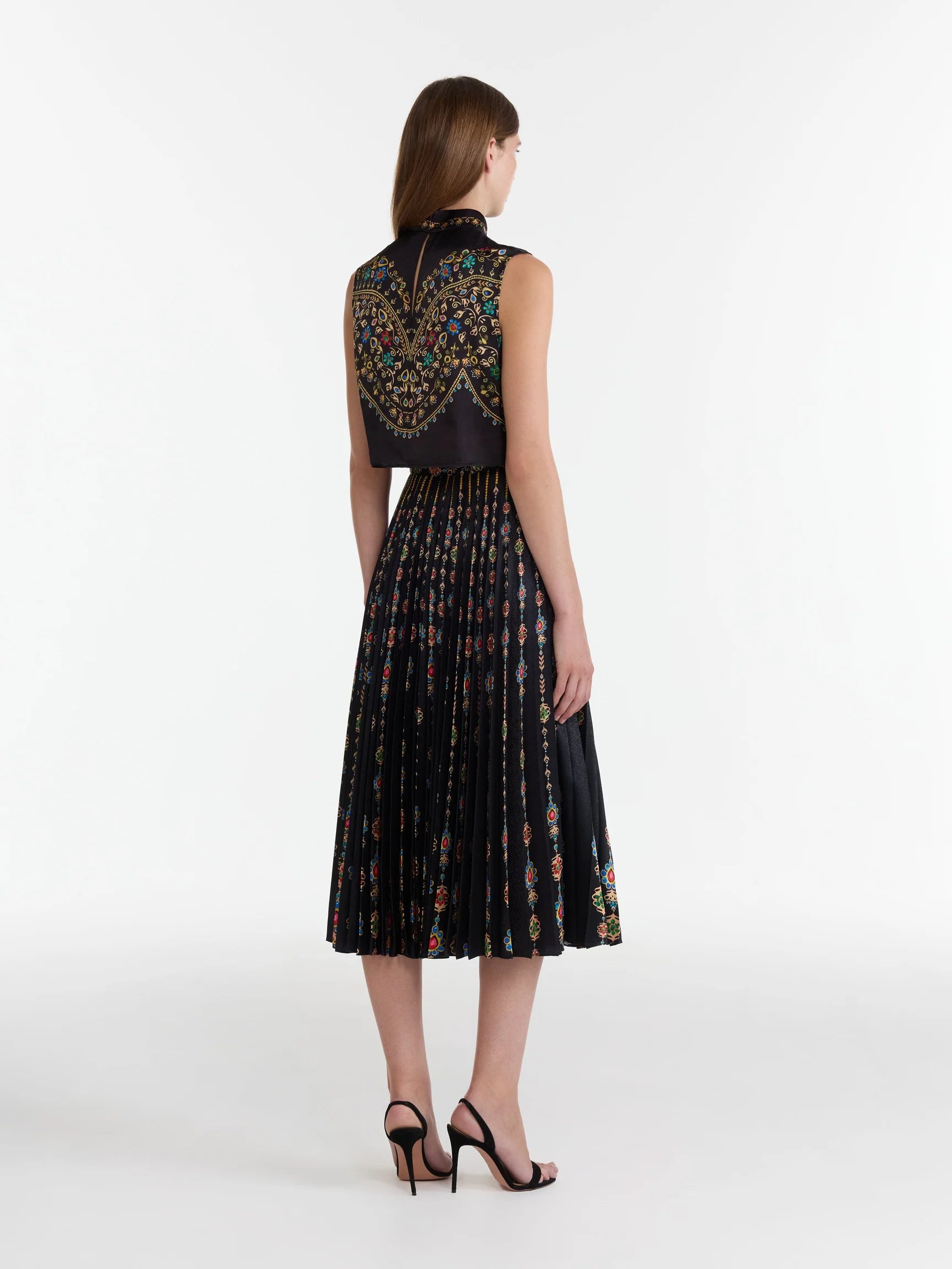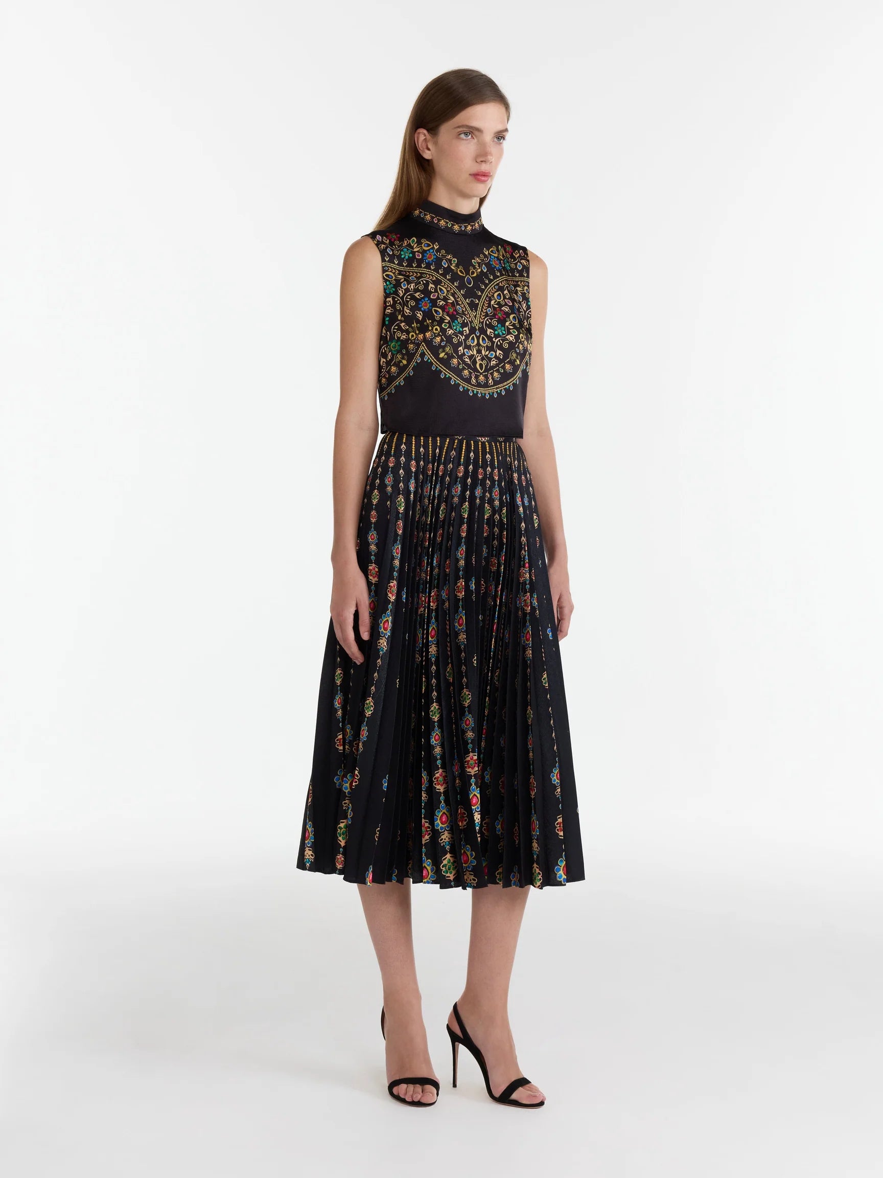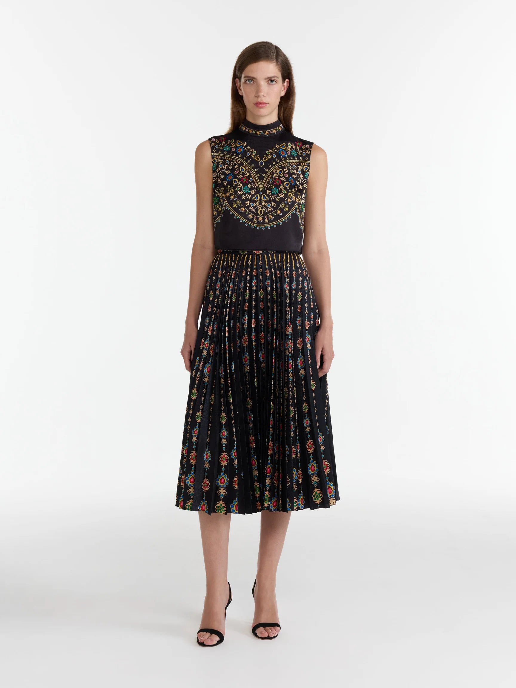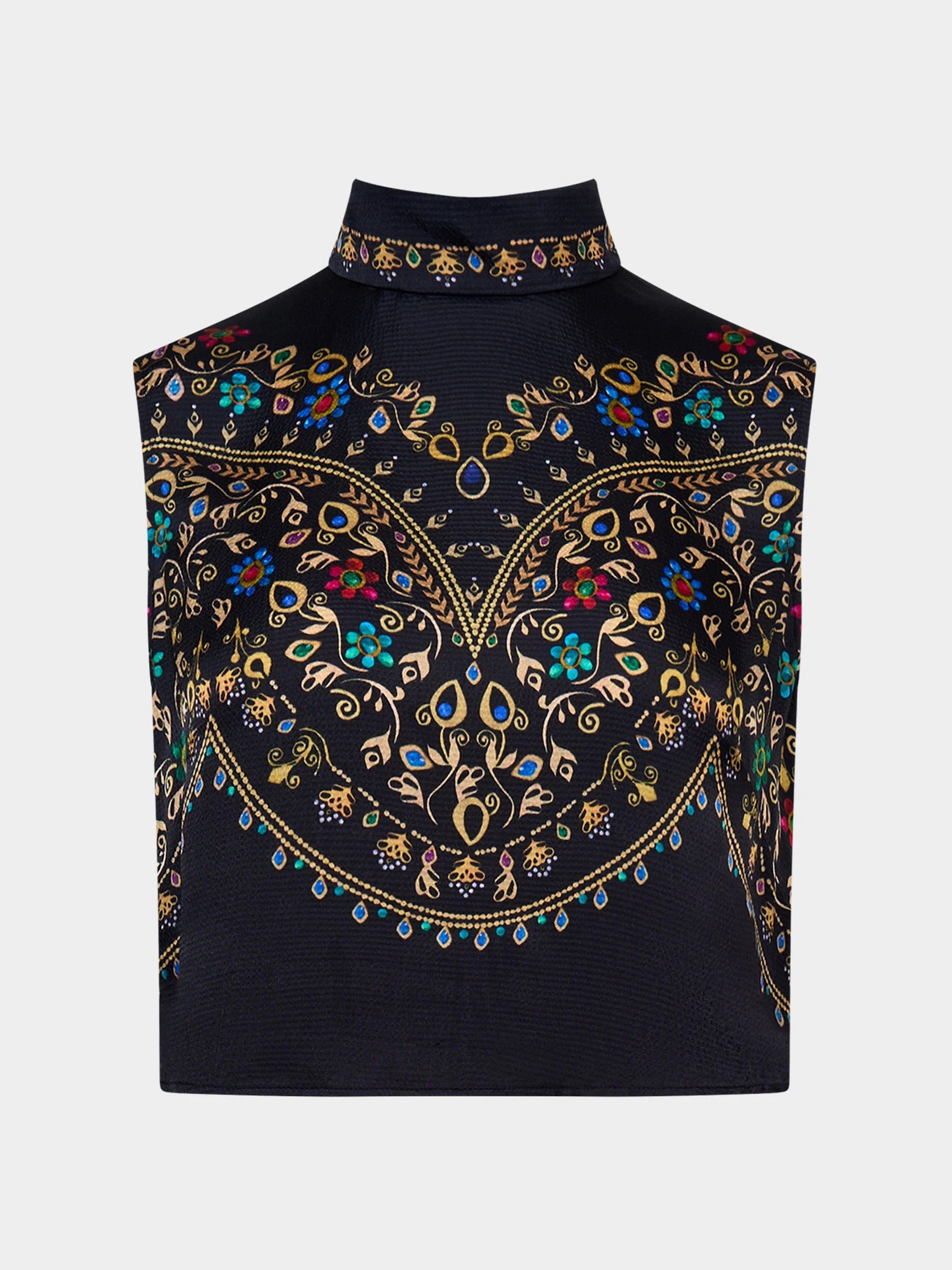 The Ren Top by Saloni is your ticket to effortless elegance with a playful twist. This hammered satin beauty boasts a sleek high collar and a mesmerizing gold pendant print studded with glittering gemstones that pop against the deep black fabric. The strategically placed bold border adds just the right amount of contemporary flair to keep things interesting. Whether you're wearing it as a statement piece or styling it with the matching Kim skirt for a coordinated moment, this top delivers sophistication with a wink. Fluid, fabulous, and ready to turn heads.