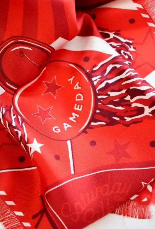 Show your spirit, Saturday-style! The Saturday Fringed Scarf by Saturday Silks is the perfect way to get your game day going with heirloom-quality style. Represent your team, your school, and yourself with this collegiate classic, and never worry about another wardrobe malfunction on game day again!