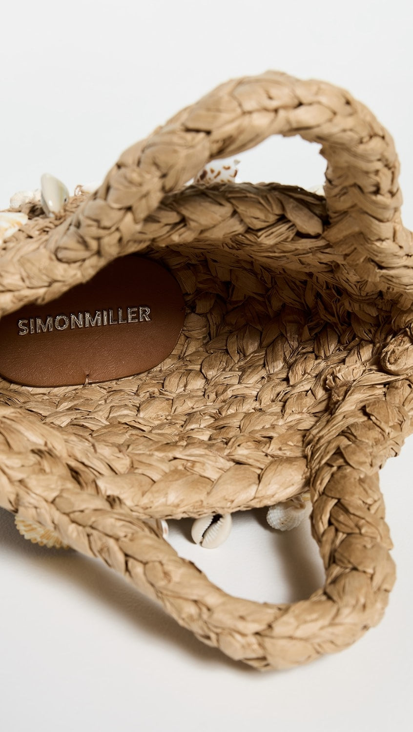 The Shelly Bag by Simon Miller is a chic hand-stitched raffia handbag adorned with real natural seashells throughout the body. A textural statement piece that blends craftsmanship with playful charm.