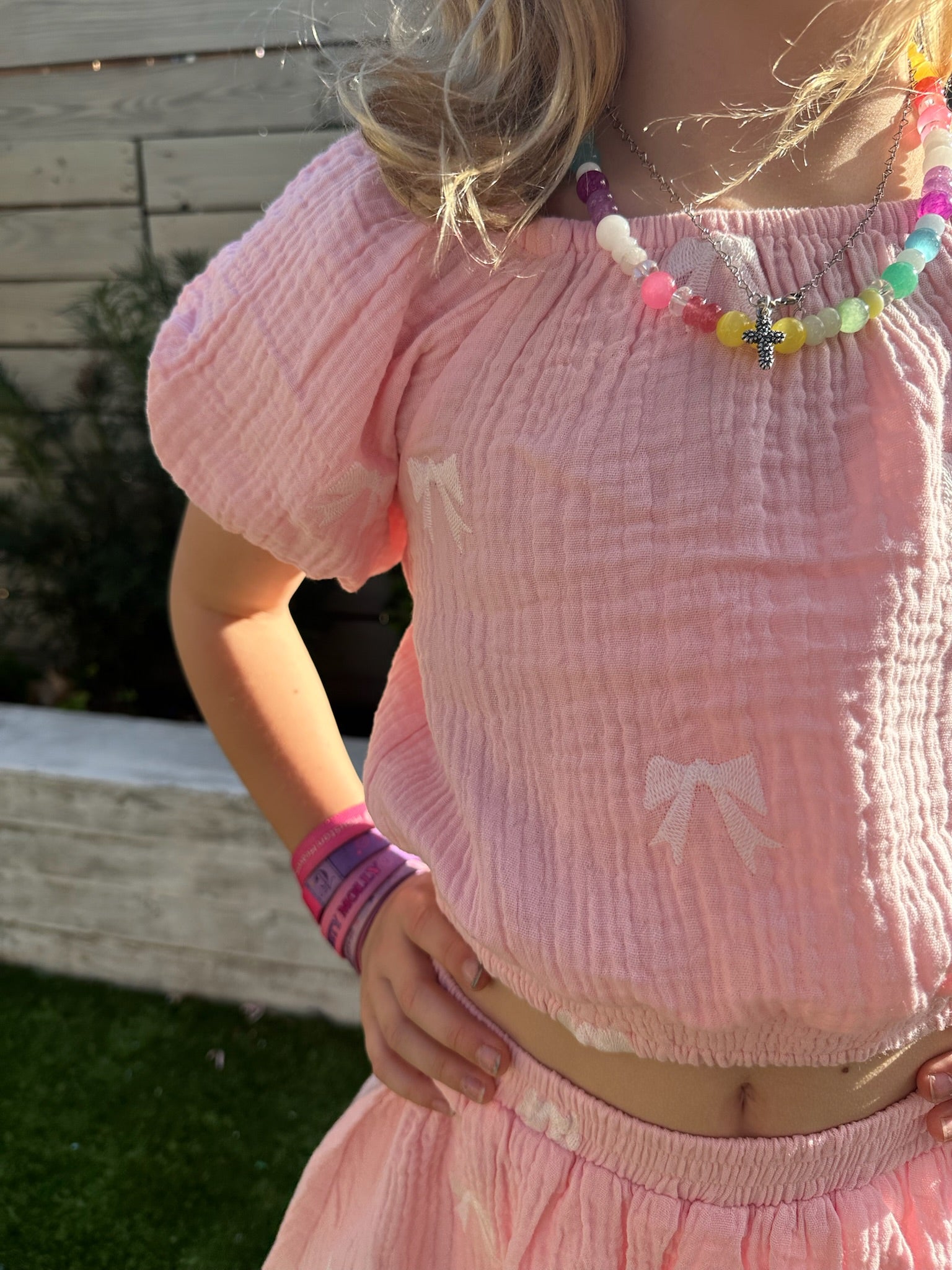 Introducing the Girls Posie Top, a charming piece perfect for spring and summer style. This gauzy top features delicate puff sleeves that add a playful touch, while the smocked waistband ensures a comfortable, adjustable fit. Adorned with an all-over bow detail for extra sweetness, it's ideal for creating coordinated looks when paired with the matching Girls Posie Skort. A versatile wardrobe essential that captures effortless, feminine style.