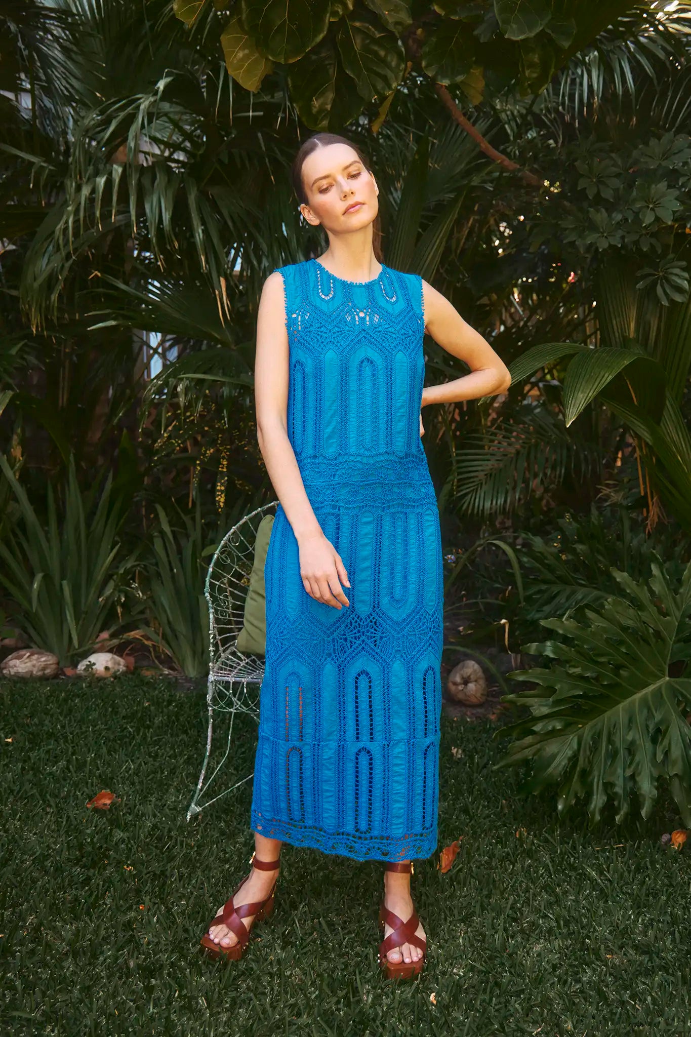 The Stowe Dress by Hunter Bell is a true showstopper, crafted in ornate guipure lace with intricate cutwork inspired by cathedral architecture. With its sleeveless design, straight fit, and refined back vent, it balances structure with graceful movement. Openwork panels reveal just enough while adding depth and dimension to the silhouette. Whether you're dressing for a garden party or an elegant evening out, this striking midi is designed to make you feel polished, powerful, and unforgettable.