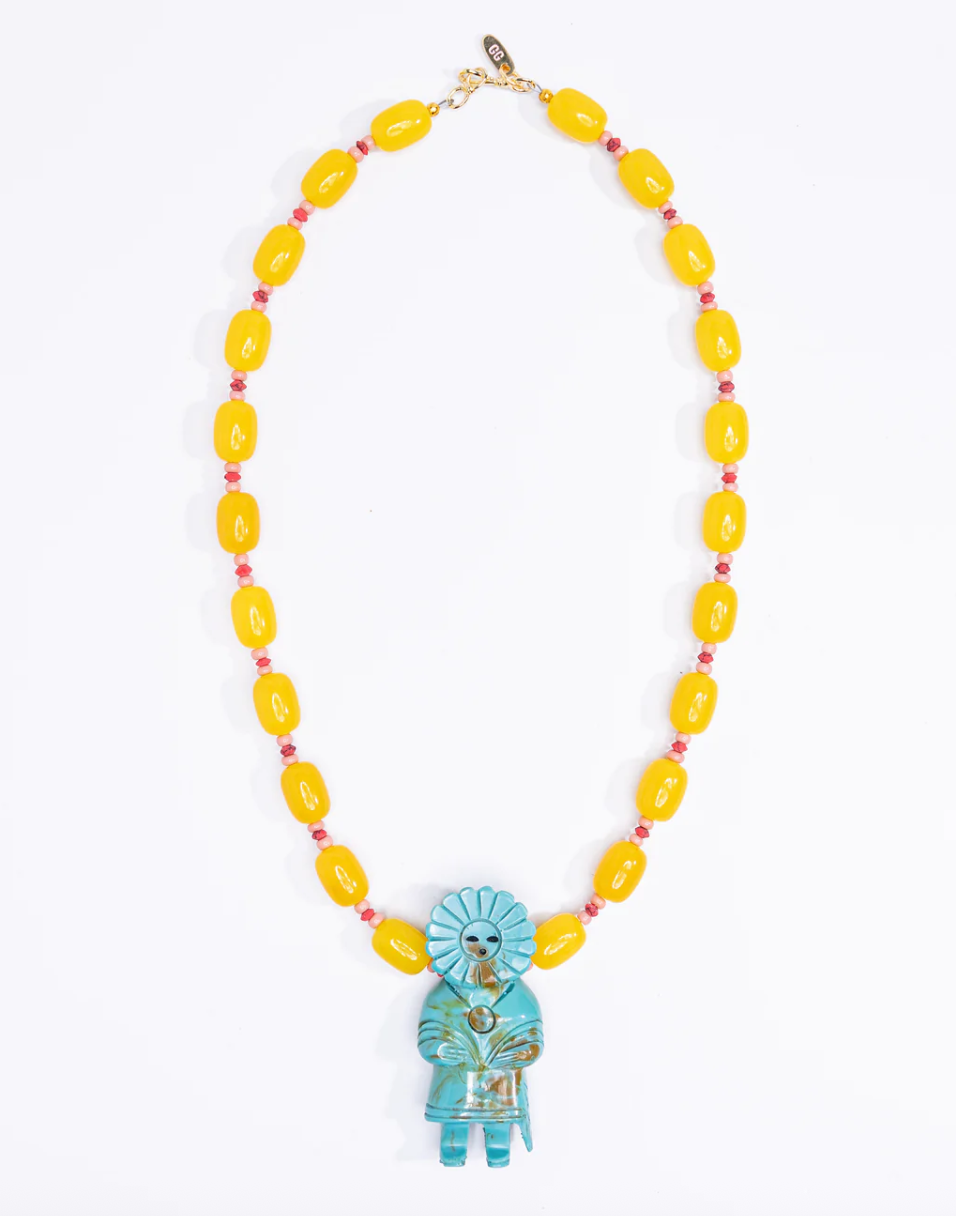 Turquoise Sun Kachina pendant mixed with yellow glass, pink and red spacers. A sun kachina represents the sun, symbolizing life, growth, warmth and hope.