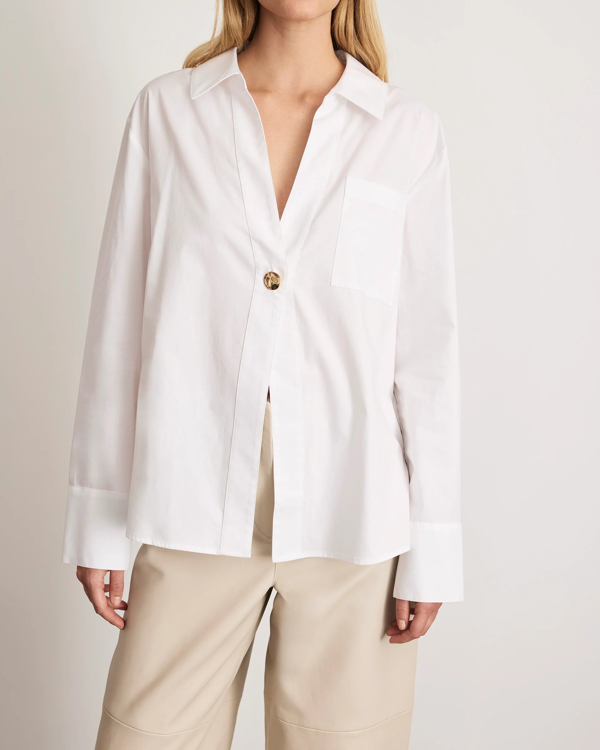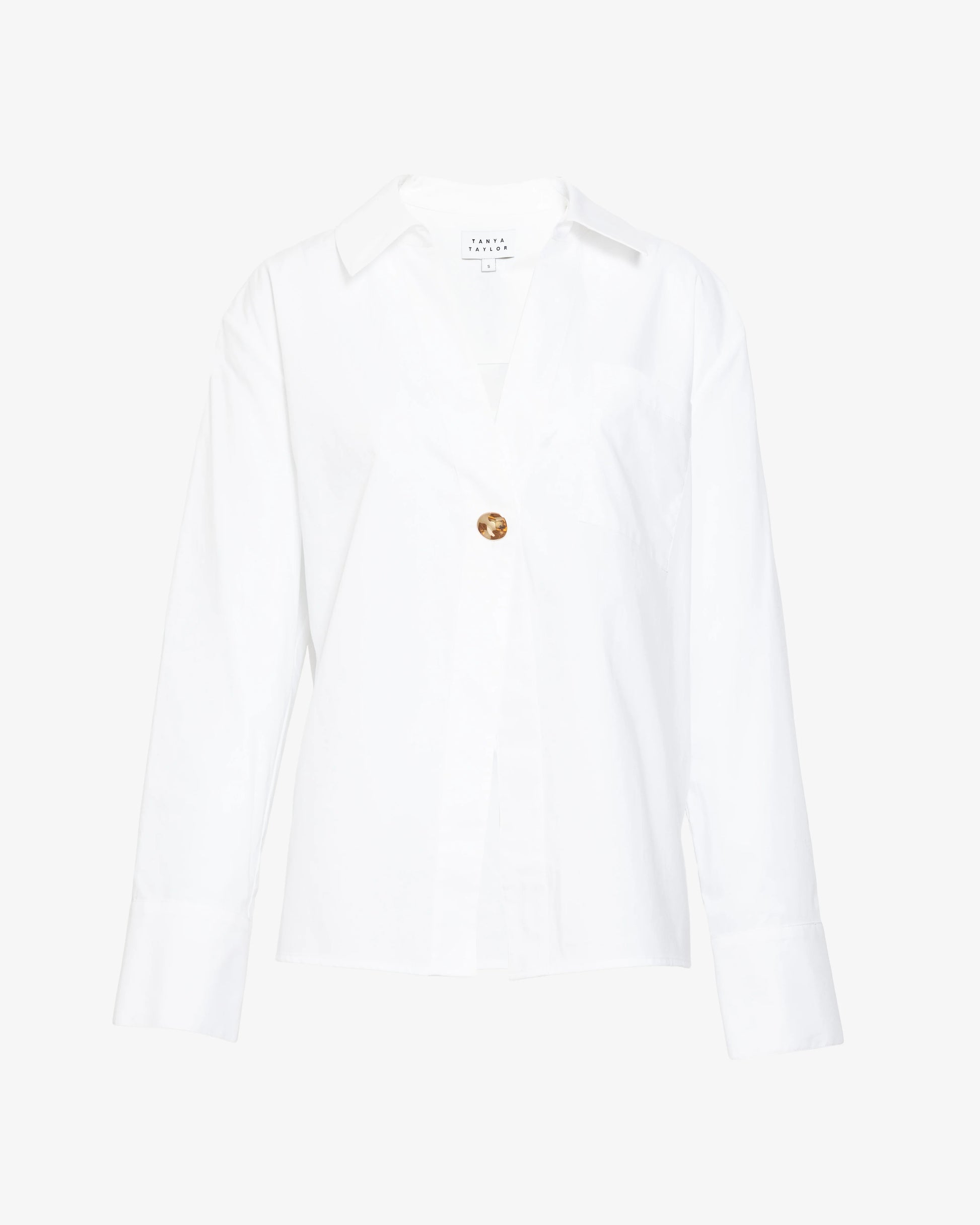The Taytum Top by Tanya Taylor is your new go-to for effortless elegance. This optic white long-sleeve beauty features a flattering V-collar and a show-stopping golden button detail that adds just the right amount of polish. Perfect for dressing up your everyday look or layering through the seasons. Simple, chic, and undeniably you.