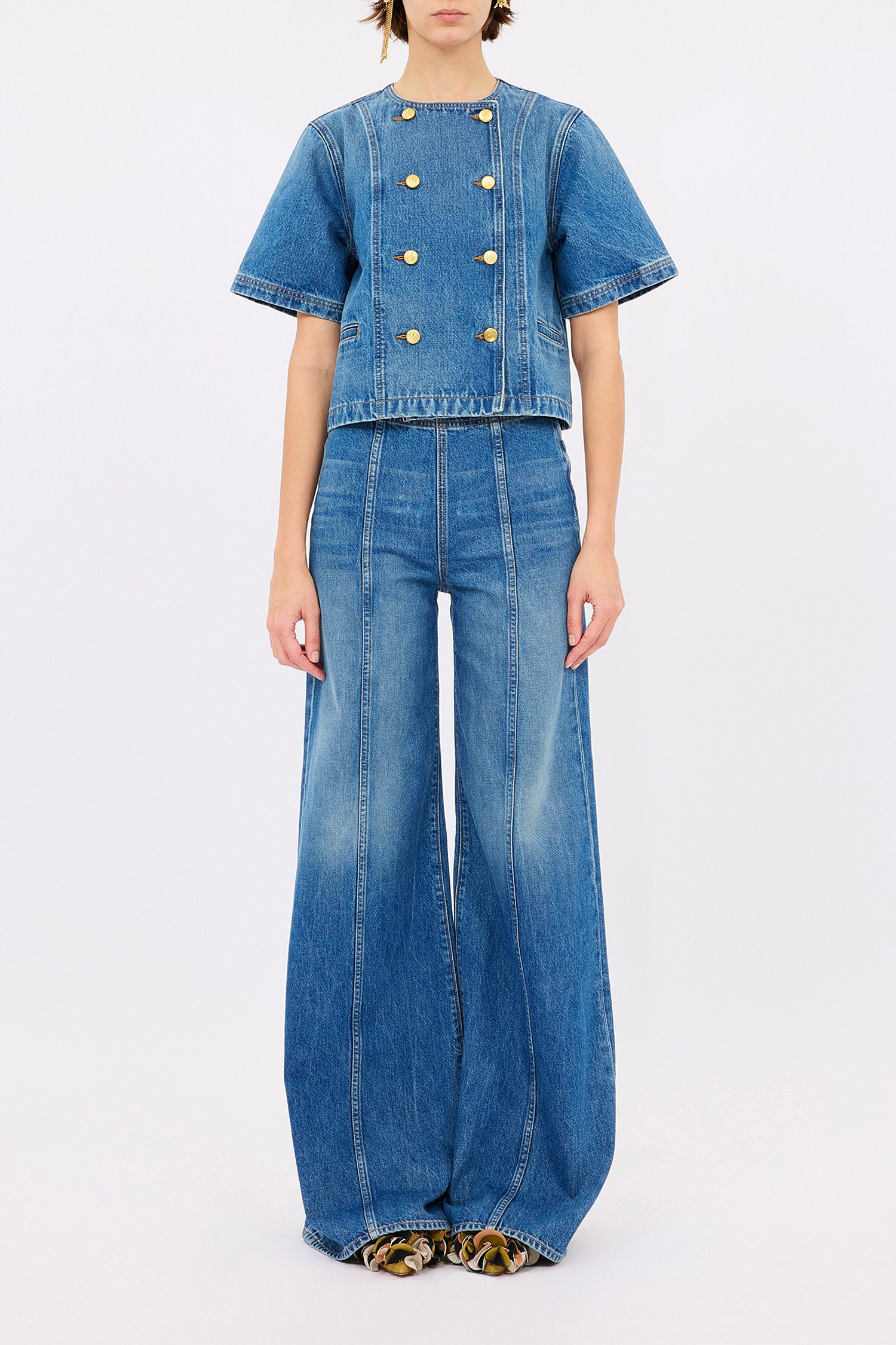 The Serge is a refined update to the classic denim jacket, designed with a collarless neckline and clean welt pockets. Handmade in Los Angeles in our medium indigo wash, this short-sleeve jacket has a double-breasted front adorned with our distinctive monogram buttons and has a cropped fit.