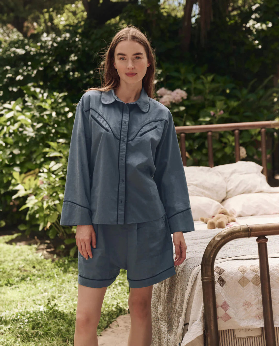 The Western Pajama Shirt is an update to our favorite menswear-inspired pajama shirts. Comfortable and relaxed in shape, it features a collared neckline, button-front closure, and Western-inspired yoke with welt pocket detailing. Made of soft 100% cotton and trimmed with contrast piping, it pairs perfectly back to The Square Pajama Short for a coordinated set.
